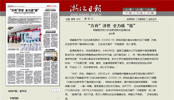 疫情發生后,今年1月22日,王瑤法博士特意讓明峰醫療微信公眾號編發《抗擊病毒:明峰醫療和所有醫護人員一同抗戰新型肺炎》的文章,并提到了已在河南省全民健康管理中心使用的明峰醫療集裝箱車載CT。