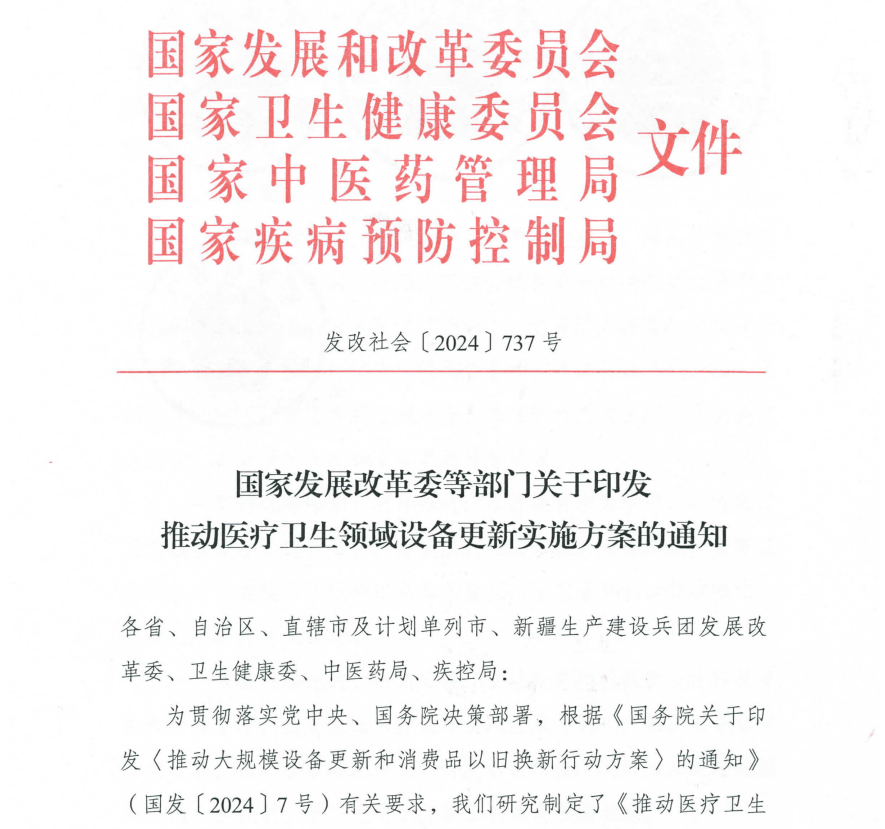 繼國務院印發《推動大規模設備更新和消費品以舊換新行動方案》后,近日,國家發展改革委等部門印發《推動醫療衛生領域設備更新實施方案》(以下簡稱《方案》),全面推進醫療衛生機構裝備和信息化設施迭代升級。