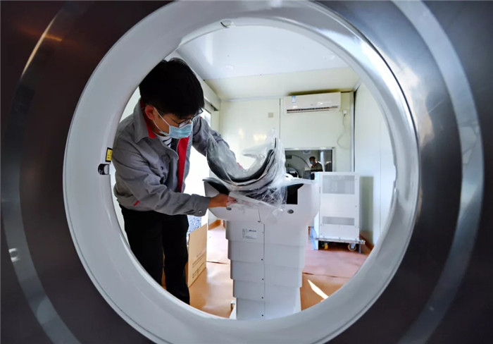 “依托研發(fā)、技術(shù)優(yōu)勢(shì),春節(jié)期間不休假,日夜無(wú)眠,奮戰(zhàn)不歇,聚力創(chuàng)新,攻克了該CT裝置核心技術(shù),在現(xiàn)有CT,PET/CT,MR,DR,US影像產(chǎn)品基礎(chǔ)上,打造了CT界“華夏方舟”——應(yīng)急專(zhuān)用CT裝置(方艙式應(yīng)急專(zhuān)用CT整體解決方案,簡(jiǎn)稱(chēng)方舟CT,含CT、屏蔽、獨(dú)立操作間、獨(dú)立掃描間、空調(diào)),創(chuàng)造了CT發(fā)展史上的全新篇章。”明峰醫(yī)療研究院副總經(jīng)理岳強(qiáng)說(shuō)。