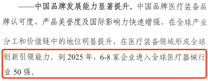 《醫療裝備產業發展規劃(2021-2025年)》(征求意見稿)在國產品牌發展能力方面也提出了具體目標——到2025年,6~8家企業進入全球醫療器械行業50強。