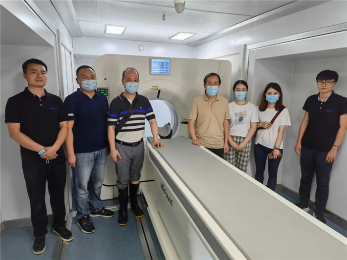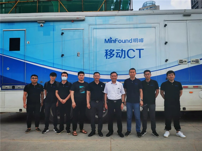 ▲鄭大一附院放射科主任張永高和劉杰技師長等人在明峰醫療移動CT內